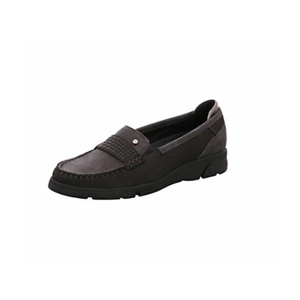 Damen Slipper von Ara aus einem feinen hochwertigem Nubukleder. Innen ist der Schuh mit einem cromfrei gegerbtem Leder ausgestattet. Der Schuh hat eine normale Weite. Der Absatz ist durchgehend flach. Die Laufsohle ist aus Gummi. Die Schuhgröße fällt regulär aus.