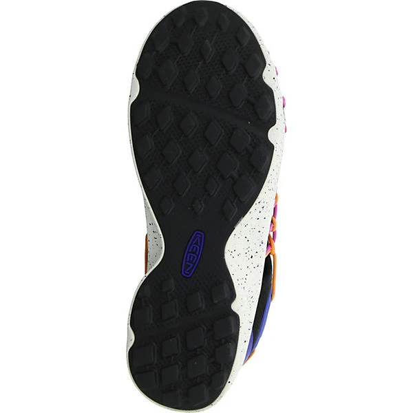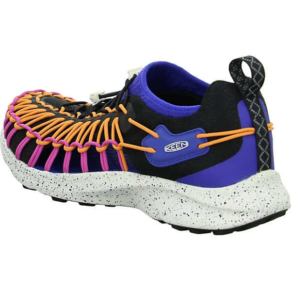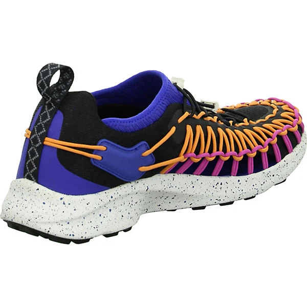 Keen Herren Slipper sportlich UNEEK SNK Schwarz mit orangen, blauen und pinken Details – seitlich offen – Zugschlaufe an der Ferse – reflektierende Details – hergestellt aus recycleden Plastikflaschen – softes Futter – rutschfeste Laufsohle – geflochtene Bänder – Schnellverschluss
