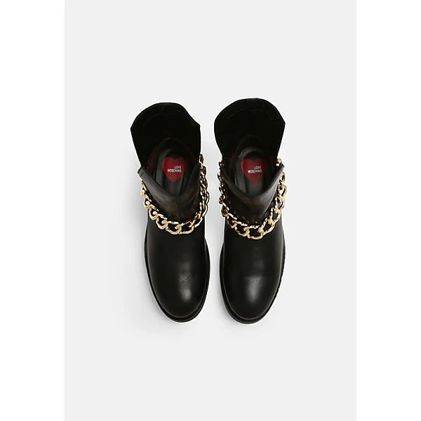 Die bequemen Ankle Boots von LOVE MOSCHINO punkten mit ihrem cleanen Design. Die goldene Kette aus Herzen dient als optisches Highlight und wertet den Schuh sowie jedes Outfit nochmal richtig auf. Seitliche Schlitze plus der Schriftzug „LOVE MOSCHINO“ auf der Gummisohle machen den Look perfekt. Ein echter Hingucker und perfekt für den Alltag.
