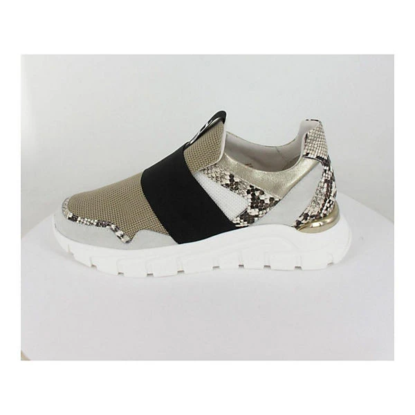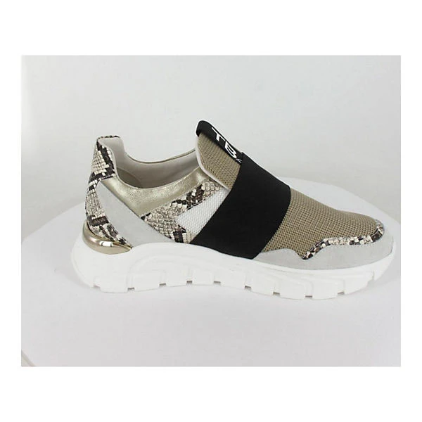 – modischer Farbmix von Tosca Blu – Schlangenleder, Gold, Beige und Sand setzen Akzente – kein Schnüren, einfach reinschlupfen und wohlfühlen – dickes, weiches Fußbett – der schwarze Gummizug über dem Schuhblatt setzt einen starken Akzent – leichter Keilabsatz mit rutschhemmender Sohle